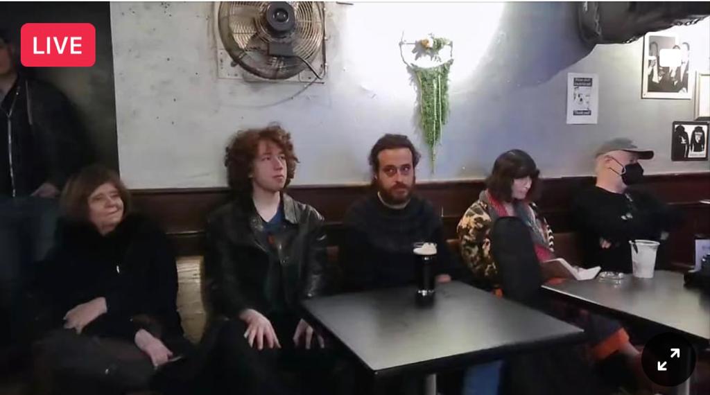 left to right: Karen Koch, Cannonball Statman, Jesse Sternberg, and Mallory Feuer (sketching whoever’s on stage) at Boog City Festival, 2023 (photo by David Kirschenbaum)